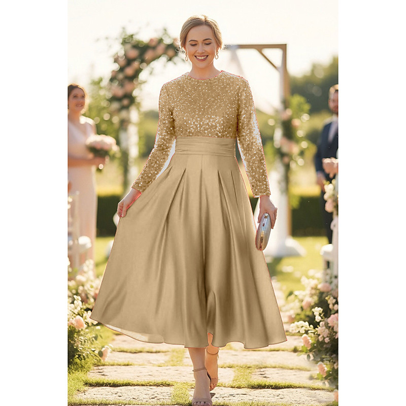 A-Line Ankle Length Tea Length Party Dress Cocktail Dress Wedding Guest Dress Mother of the Bride Dress Long Sleeve Crew Neck Elegant Sparkle Shine Formal Wedding Guest Satin Sequined with Pleats