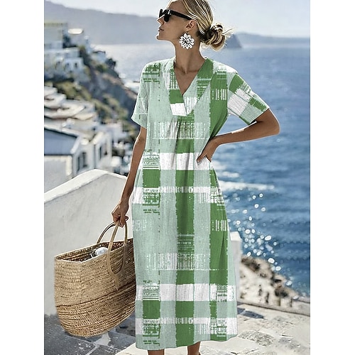 Per donna Abito Midi Abito a Tubino Vestito Estivo Vacanza Casual Spiaggia Quotidiano Uscire Vestibilità comoda Grafico Geometrico Manica Corta Scollo a V Blu Verde chiaro Viola Verde Estate Primavera