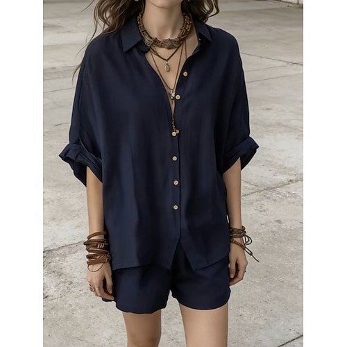 Per donna Set di biancheria in cotone Set di Pantaloncini Manica Corta Colletto a Camicia Semplice Moda Streetwear Casuale Quotidiano All'aperto Nero Bianco Rosa Estate Vestibilità comoda