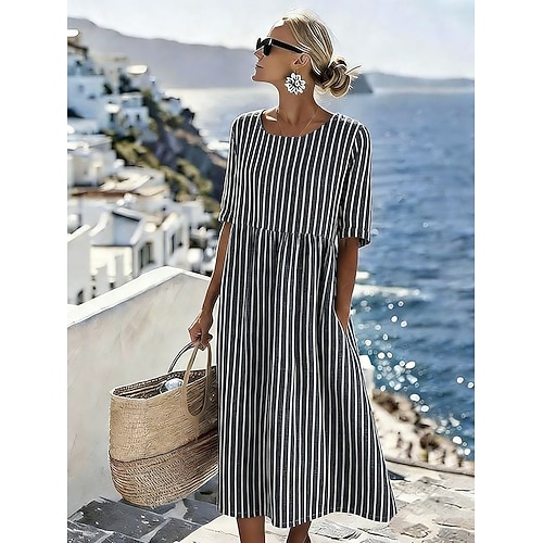 Per donna Abito Midi Abito a Tubino Vacanza Casual Vestibilità comoda Grafico A righe Manica Corta Girocollo Blu Viola Marrone Verde Estate Primavera