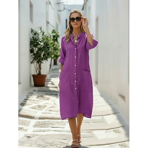 Per donna Taglie Forti Abito Midi Finto cotone e lino Abito Camicia Vestito Casual Semplice Essenziale Casual Quotidiano Casa Vacanza Vestibilità comoda Colore Puro Manica Lunga Colletto a Camicia