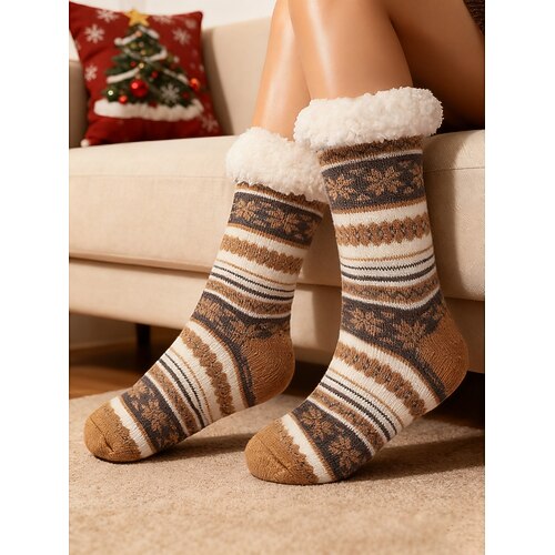 Calzini da pavimento in maglia soffice natalizia da uomo, caldi calzini da casa con motivo a fiocco di neve rosso e nero e fodera in morbida peluche per le feste abbigliamento invernale da interno