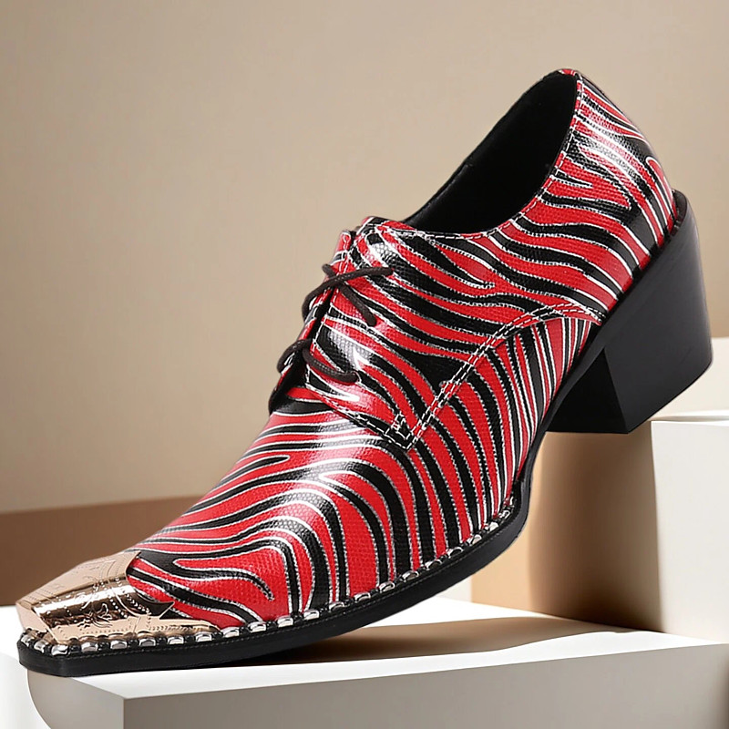 Men's Red and Black Zebra Print Dress Boots – Premium Leather with Metallic Details, Stylish and Bold for Christmas Parties and Festive Celebrations in a Christmas Setting