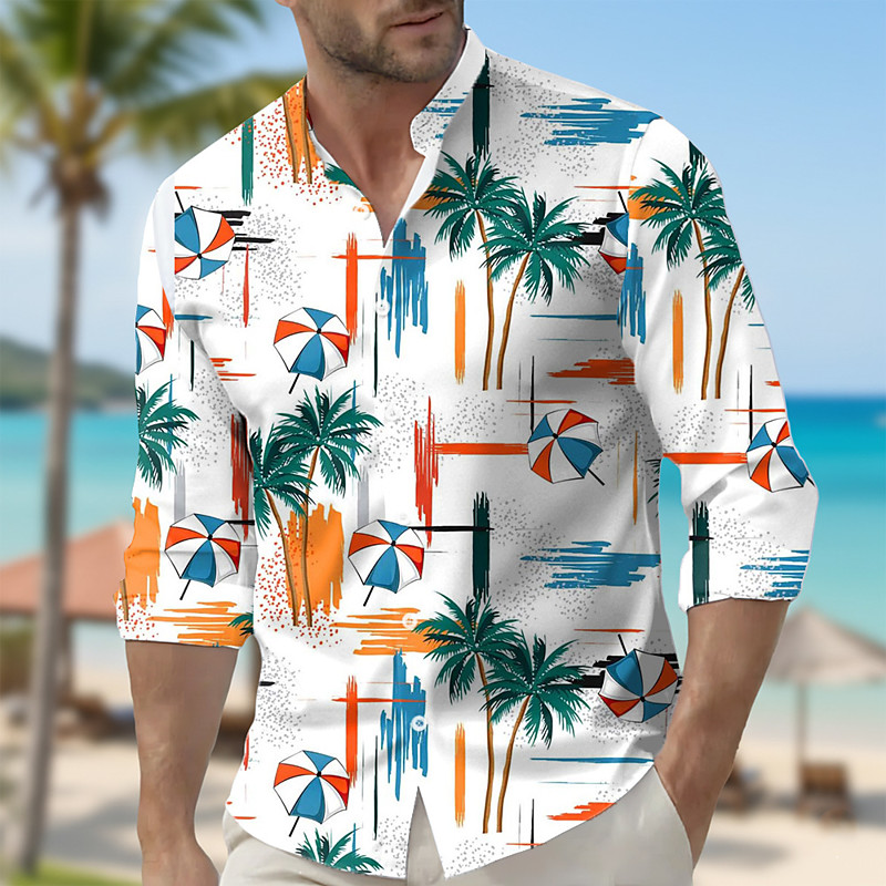 Men's Geometric Coconut Tree Tropical Plants Shirt Hawaiian Shirt Stand Collar Shirt Long Sleeve Hawaiian Outdoor Vacation Spring Fall Mandarin Collar Band Collar 3D Print Button Up Shirts Blue Purple