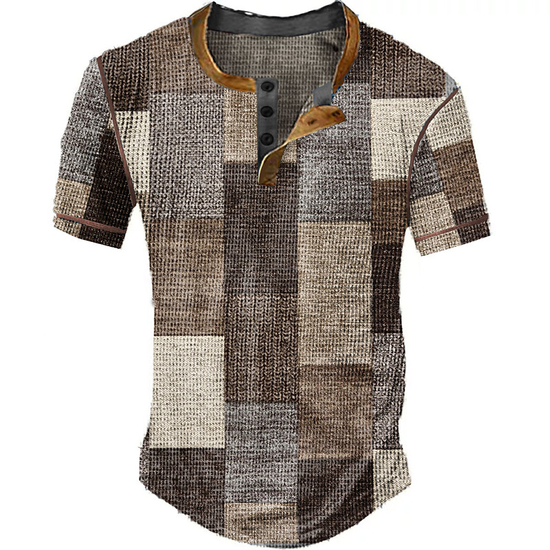 Men's Graphic Plaid Color Block Waffle Henley Shirt Short Sleeve 3D Print Vintage Fashion Designer Outdoor Daily Summer White Red Blue Orange Khaki Henley Henley T-Shirt