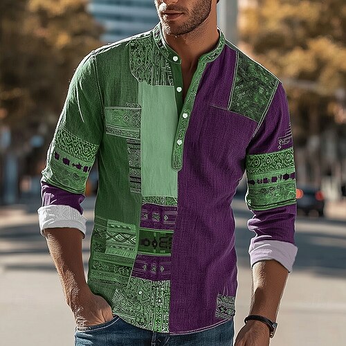 Per uomo Geometrico Blocco di colori Patchwork Camicia Maglia Henley Camicia con colletto alla coreana Manica Lunga Vintage Retrò Vacanza Casuale Estate Primavera Mandarino Bottoni Camicia tipo lino