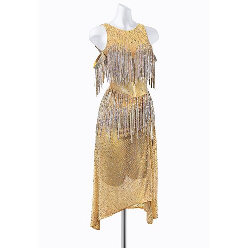 abito da ballo latino da donna con frange in strass dorati - senza maniche, spalle scoperte, multistrato, asimmetrico, per spettacoli da ballo da sala