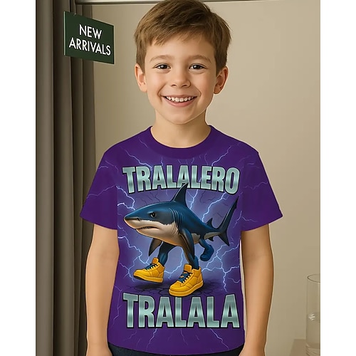 T-shirt grafica per ragazzi con squalo Tralalero Tralala - maglietta estiva casual viola vivace con squalo stampato in 3D maglietta grafica giocosa con scollo rotondo e maniche corte, traspirante, da