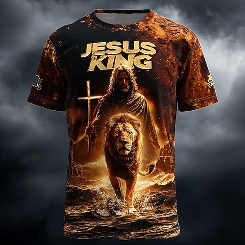 Maglietta T-Shirt Uomo Bibbia Gesù Re Leone Di Giuda Croce Onde Potente Cristiano Religioso Stampa Completa Maniche Corte Collo A Giro Chiesa Regalo Spirituale Abbigliamento Designer