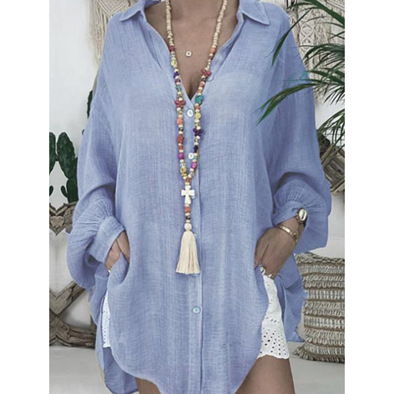 Women's Shirt Button Up Blouse Faux Cotton Linen Solid Color Basic Casual Long Sleeve Polo Collar Long Tops Daily Buttons Blue Black White Gray Summer