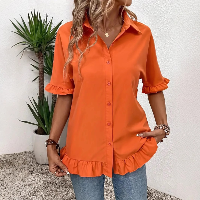Women's Shirt Blouse Plain Stylish Long Sleeve Shirt Collar Regular Tops Daily Going out Ruched Ruffle Buttons White Orange Summer Spring