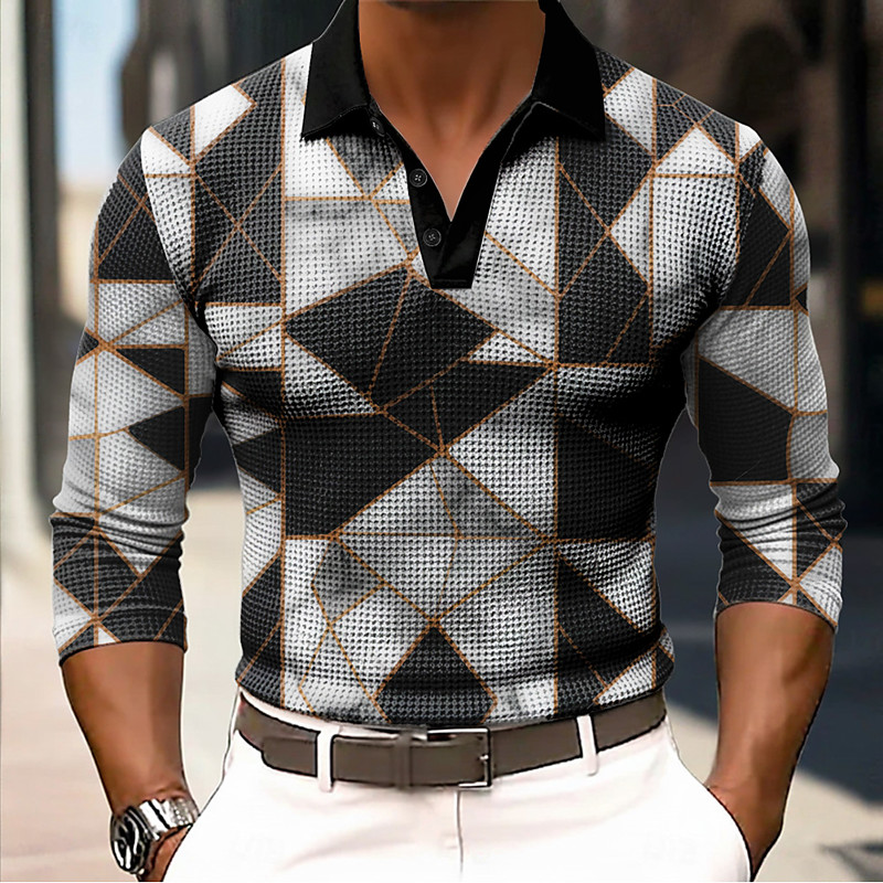 Men's Geometic Waffle Polo Shirts Long Sleeve Polo Shirts Collared Shirts Casual Daily Wear Buttons Spring Fall Winter Black