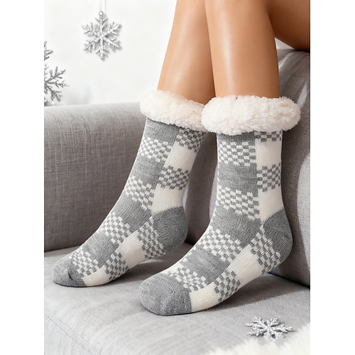 Flauschige Weihnachtssocken aus Strick für Damen, gemütliche Hausschuhe mit rot-weißem Karomuster und Plüschfutter für die Weihnachtsfeier Winter-Loungewear