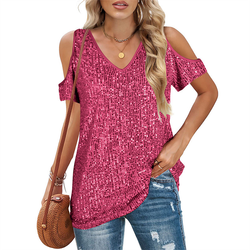 Women's T Shirt Summer Tops Solid Color Elegant Fashion Classic Short Sleeve V Neck Regular Tops Daily Going out Weekend Sequins Patchwork Blue Black White Yellow Pink Summer Spring