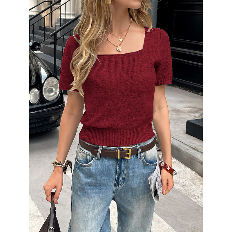 Women's Ribbed Knit Tops Solid Color Elegant Fashion Casual Short Sleeve Square Neck Regular Tops Daily Going out Weekend Black Wine Light Grey Gray Spring Fall