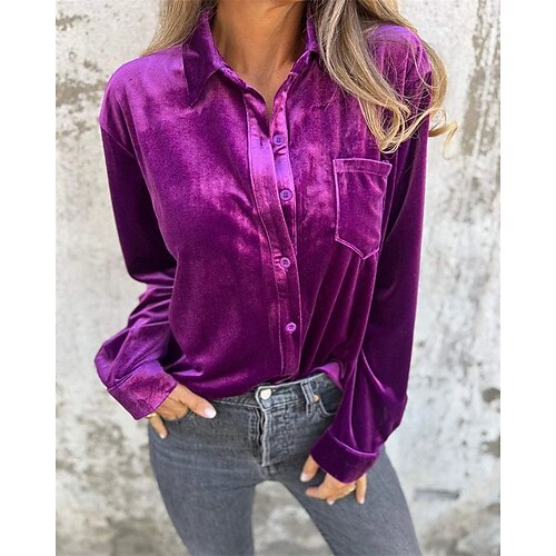 Per donna Camicia Velluto Elegant Elegante Semplice Elegante Signore Romantico Manica Lunga Colletto a Camicia Top Regolari Lavoro Quotidiano Ferie Tasca Bottoni Drappeggiato Vino Verde militare