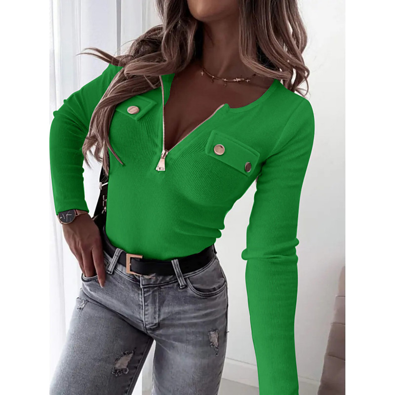 Women's Blouse Solid Color Stylish Casual Long Sleeve Crew Neck Regular Tops Daily Zipper Buttons Black White Blue Green Spring Fall Winter