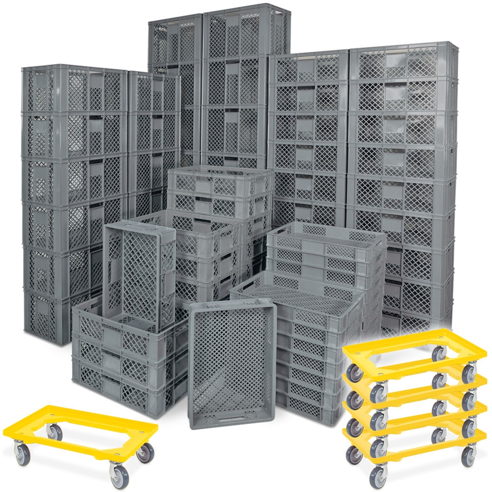 BRB 78 Stück Stapelkörbe/Bäckerkästen in 5 Größen, Grundmaß LxB 600 x 400 mm, H 90 mm, 150 mm, 240 mm, 320 mm, 410 mm, Farbe grau, gelb