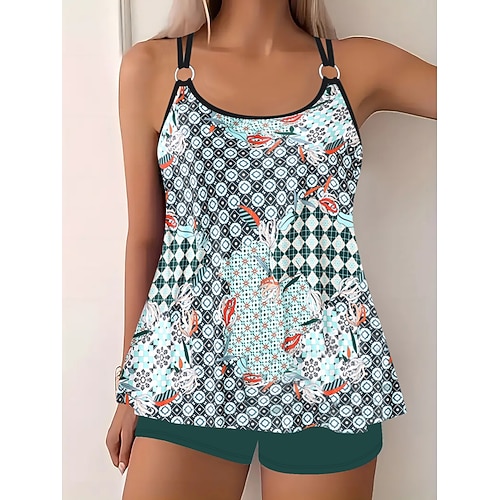 Costume da bagno due pezzi tankini da donna con pantaloni corti palmo controllo della pancia vita alta slanciato senza schienale abbigliamento da spiaggia per le vacanze blocco di colore foglie collo
