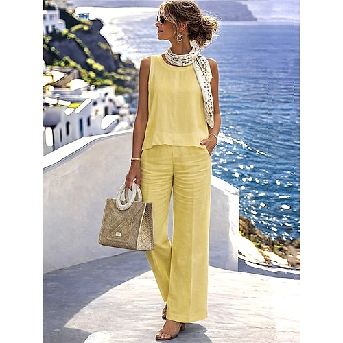 Per donna Set di Pantaloni Bolero Top Finto cotone e lino Senza Maniche Girocollo Tinta unica Semplice Moda Streetwear Casuale Quotidiano All'aperto Giallo Estate Vestibilità comoda