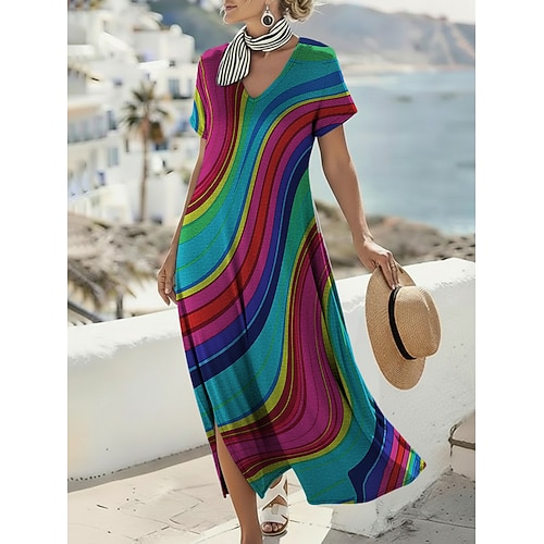 Per donna Abito Midi Abito a trapezio Vacanza Casual All'aperto Uscire Vestibilità comoda A righe Manica Corta Collo ripiegato Blu Bianco Rosso Viola Estate Primavera Autunno