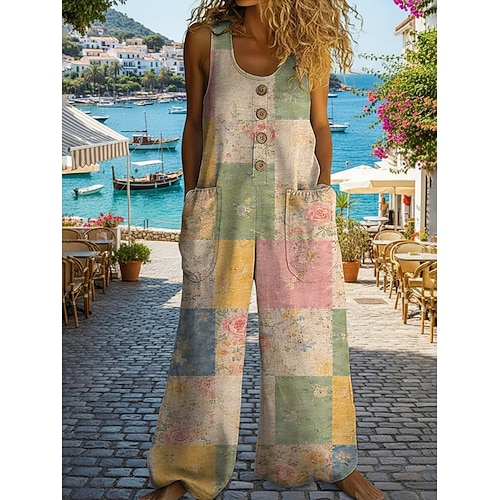 Per donna Tuta Attivo Floreale Senza Maniche Senza maniche Gamba larga Collo a U Tasca Bottoni Quotidiano Spiaggia Vestibilità comoda Verde Estate