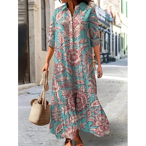 Per donna Abito maxi Finto cotone e lino Abito Camicia Vestito Casual Abito a trapezio Elegante Vintage Quotidiano Vacanza Uscire Vestibilità comoda Floreale Manica Lunga Colletto a Camicia Blu Rosa