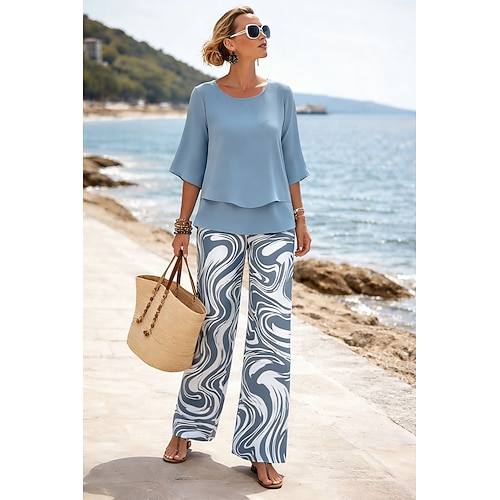 Per donna Set di Pantaloni Mezza Manica A farfalla Girocollo Grafico Geometrico Elegante Vacanza Casuale Quotidiano Spiaggia Blu Verde Cachi Primavera Estate Vestibilità comoda