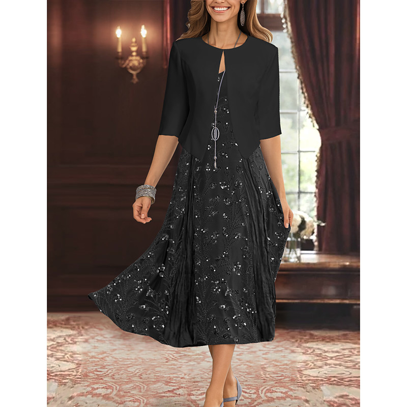Two Piece A-Line Tea Length Wedding Guest Dress Mother of the Bride Dress Short Sleeve Jewel Neck Elegant Plus Size Wedding Guest Wedding Party Chiffon Lace Jacket Dresses with Solid Color