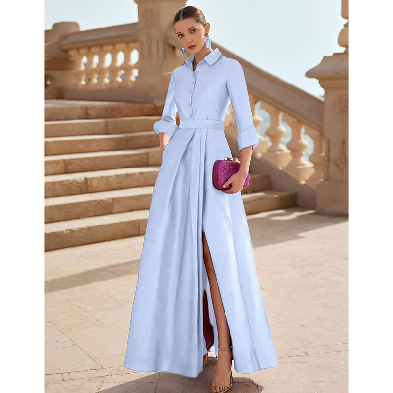 A-Line Floor Length Shirt Dress Wedding Guest Dress Formal Dresses Mother of the Bride Dress Long Sleeve Shirt Collar Elegant Wedding Formal Satin with Slit