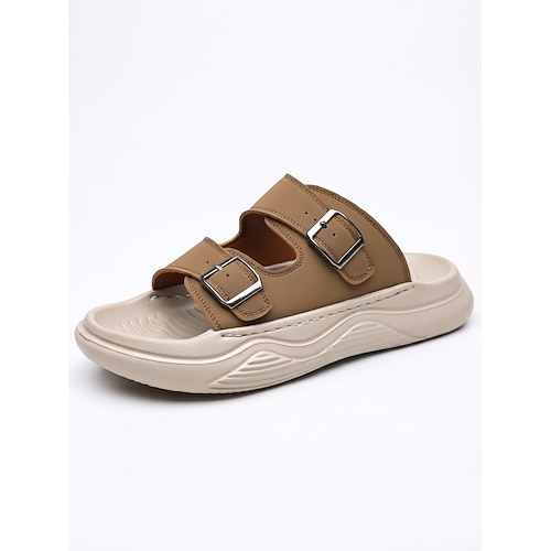 Sandali da uomo beige con doppia fibbia, a punta aperta, casual, estivi, leggeri e comodi, ideali per vacanze al mare, resort, viaggi, relax in piscina e per l'uso quotidiano nelle giornate calde.