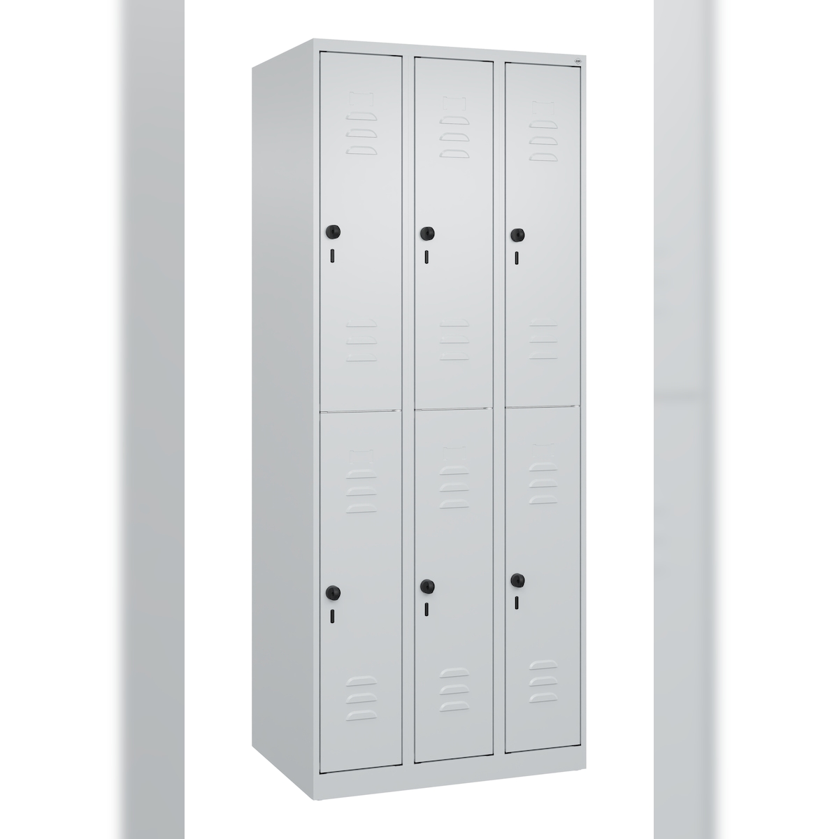 Doppelstock-Spind Evolo PLUS, 3 Abteile, grau, B 900 mm, mit breiten Füßen, Zylinderschloss C+P