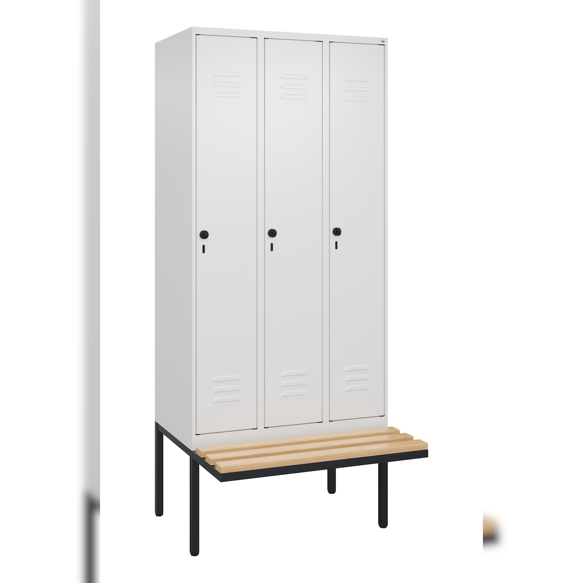 C+P Spind Classic PLUS, schwebender Sitzbank aus Buche 3 Abteile, HxBxT 212x90x82cm, Sicherheitsdrehriegel, Verkehrsweiß von PROREGAL