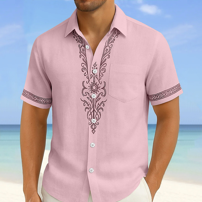 Men's Floral Print Ethnic Flowers Shirt Summer Shirt Button Up Shirt Short Sleeve Vintage Retro Vacation Holiday Streetwear Summer Turndown 3D Print Front One Pocket Linen Like Shirt Pink Blue Green
