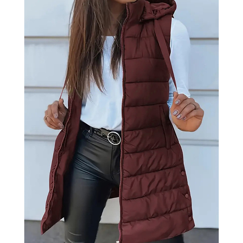 Women's Down Jacket Vest Comfortable Zipper Pocket Casual Plain Vacation Street Daily Wear Going out Long Hooded Regular Fit Sleeveless Outerwear Black Wine Red Fall Winter
