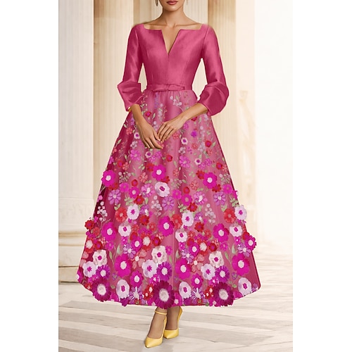 Linea ad A Lunghezza Tè Abiti da Cocktail Abiti da festa Elegante Manica 3/4 Scollo a V Festa in giardino Matrimonio Taffetà con Fiocco/Fiocchi Applicazioni