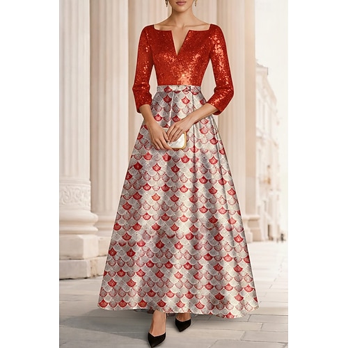 Abito da sera A-Line in oro con paillettes jacquard a motivo scallop elegante abito formale da matrimonio lunghezza fino al pavimento manica 3/4 collo quadrato con paillettes e fiocchi