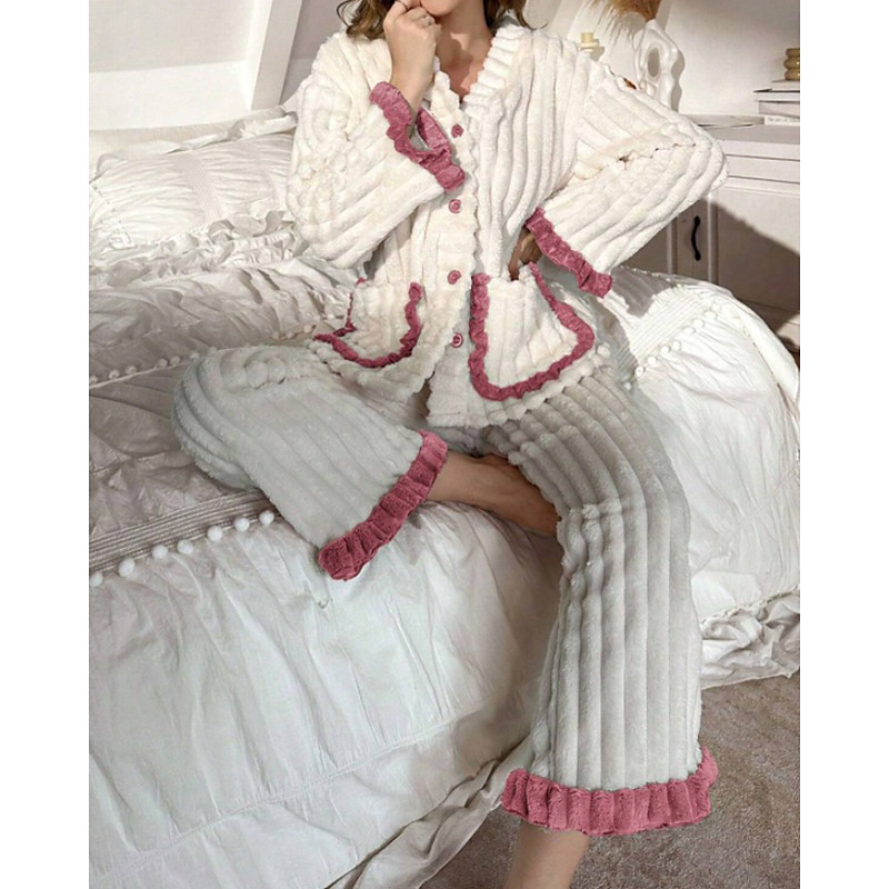 Women's Pajamas Pajama Set 2 Pieces Flannel Fashion Casual Patchwork Pocket Elastic Waist Buttons Pant Home Daily Bed Long Sleeve V Neck White Red Purple Green Fall Winter