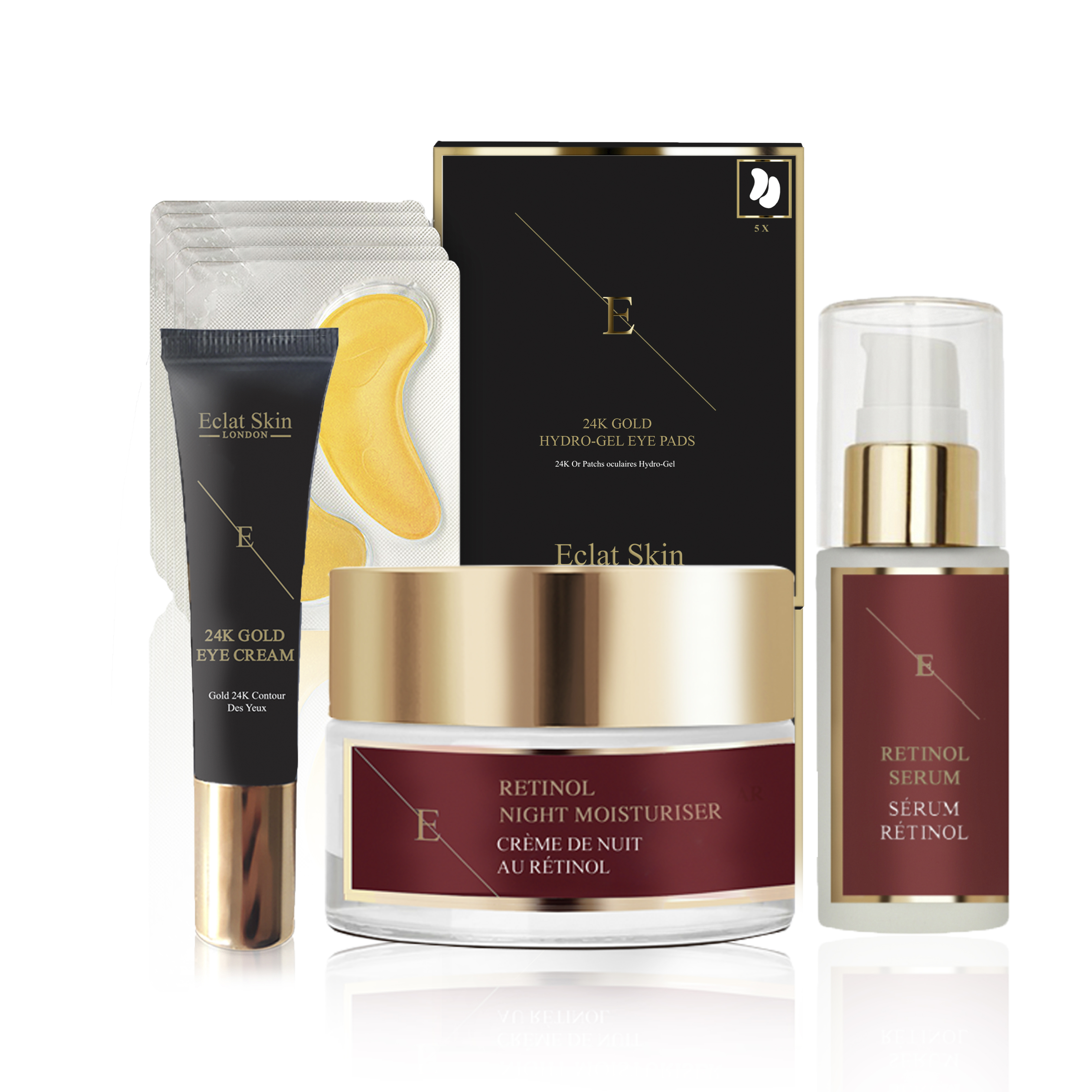 Eclat Skin London Unisex Pro Retinol + Caviar Serum 30ml + Moisturiser 50ml + Collagen Gold Under Eye Patch 24K - 5X2 Pads + Eye Cream 24K - 15ml Silk - One Size