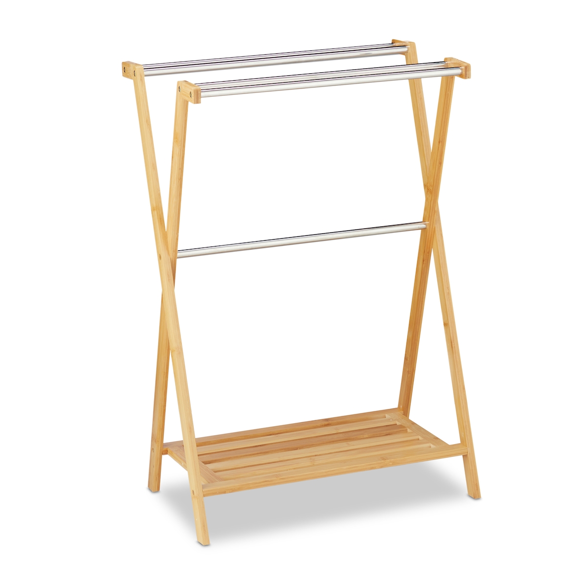 Relaxdays Handtuchhalter stehend, 5 Stangen, Bambus, Edelstahl, Bad Handtuchständer mit Ablage, HBT 87x58,5x36 cm, natur