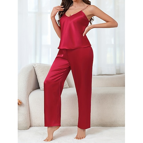 Per donna Pigiama Set Pigiama Semplice Casual Colore Puro Pizzo Elastico in vita Pantalone Quotidiano Casa Vacanza Senza Maniche Spalline Nero Rosa Rosso Beige Estate Primavera Vestibilità regolare