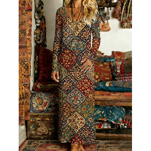 Per donna Abito Lungo Maxi Abito Abito Vintage Vestito Casual Vintage Quotidiano All'aperto Vacanza Vestibilità regolare Floreale Manica Lunga Scollo a V Vino Primavera Autunno