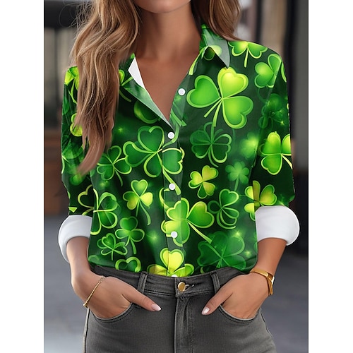 Festa di San Patrizio Per donna Blusa Grafico Trifoglio Vintage Elegante Casual Manica Lunga Colletto a Camicia Top Regolari Quotidiano Lavoro Bottoni Stampato Bianco Verde Primavera Inverno