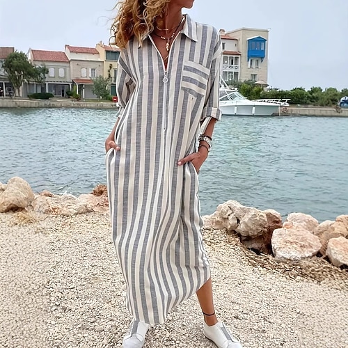 Per donna Abito Midi Vestito Casual Elegante Spiaggia Vestibilità comoda Grafico A righe Manica Lunga Colletto a Camicia Blu Giallo Rosa Verde Estate Primavera