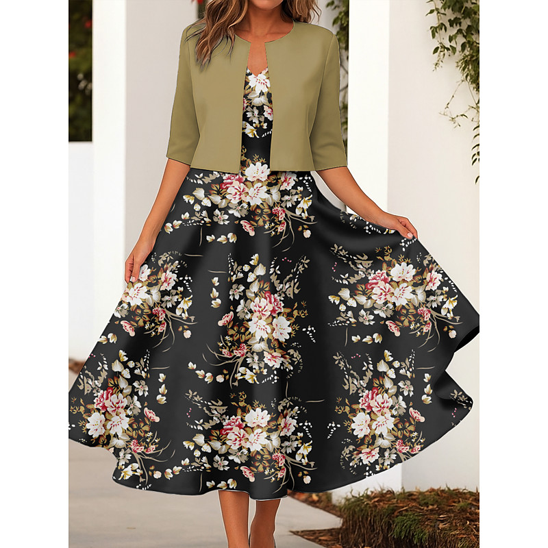 Women's Two Piece Dress Sets Midi Dress with Jacket Elegant A Line Dress Half Sleeve Party Floral Print 3/4 Length Sleeve Crew Neck Daily Yellow Blue Purple Spring Fall Regular Fit