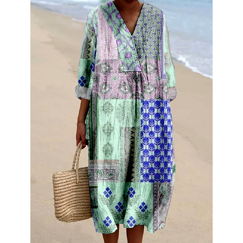 Women's Midi Dress Sundress A Line Dress Vacation Casual Boho Party Holiday Beach Loose Fit Floral Graphic Geometric Long Sleeve V Neck Black Blue Orange Green Summer Spring Fall