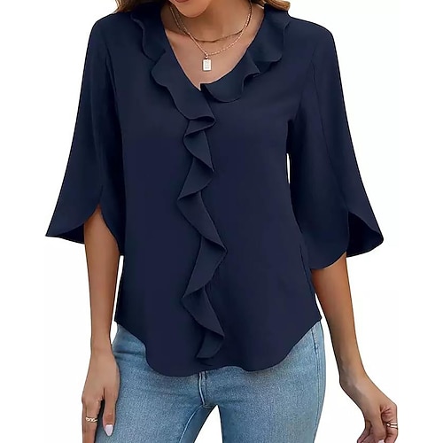 Per donna Blusa Semplice Elegante Manica Lunga Scollo a V Top Regolari Ferie Uscire Volant Nero Rosa Blu marino Azzurro cielo Estate Primavera Autunno