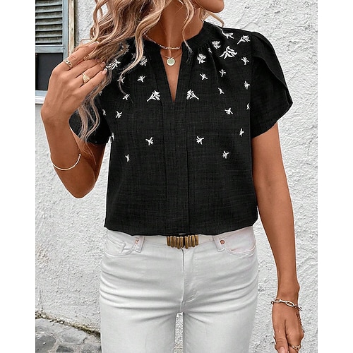 Per donna Blusa Floreale Elegante Manica Corta Scollo a V Top Regolari Quotidiano Ferie Uscire Arricciato Stampato Nero Vino Blu Reale Verde Cachi Estate Primavera Autunno
