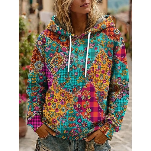 Per donna Pullover Felpe con cappuccio Floreale Plaid Retrò Casual Boho Manica Lunga Con Cappuccio Top Regolari Abbigliamento Quotidiano Casuale Coulisse Tasca Stampato Blu Primavera Autunno