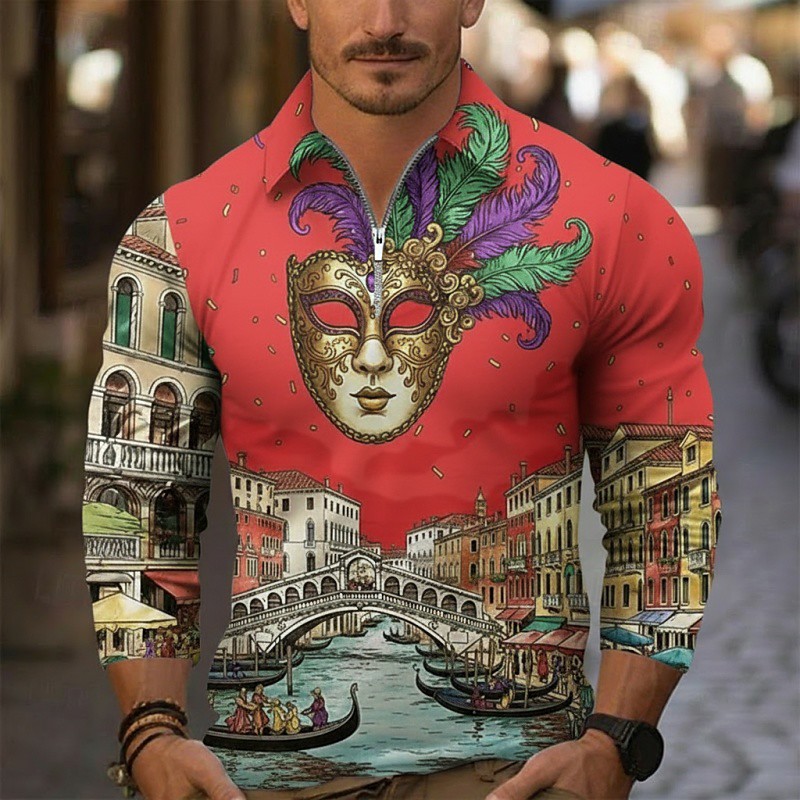 Men's Polo Polo Shirts Daily Carnival Lapel Long Sleeve Fashion Hawaiian Graphic Mask Printing Quarter Zip Spring Fall Regular Fit Yellow Red Light Blue Polo